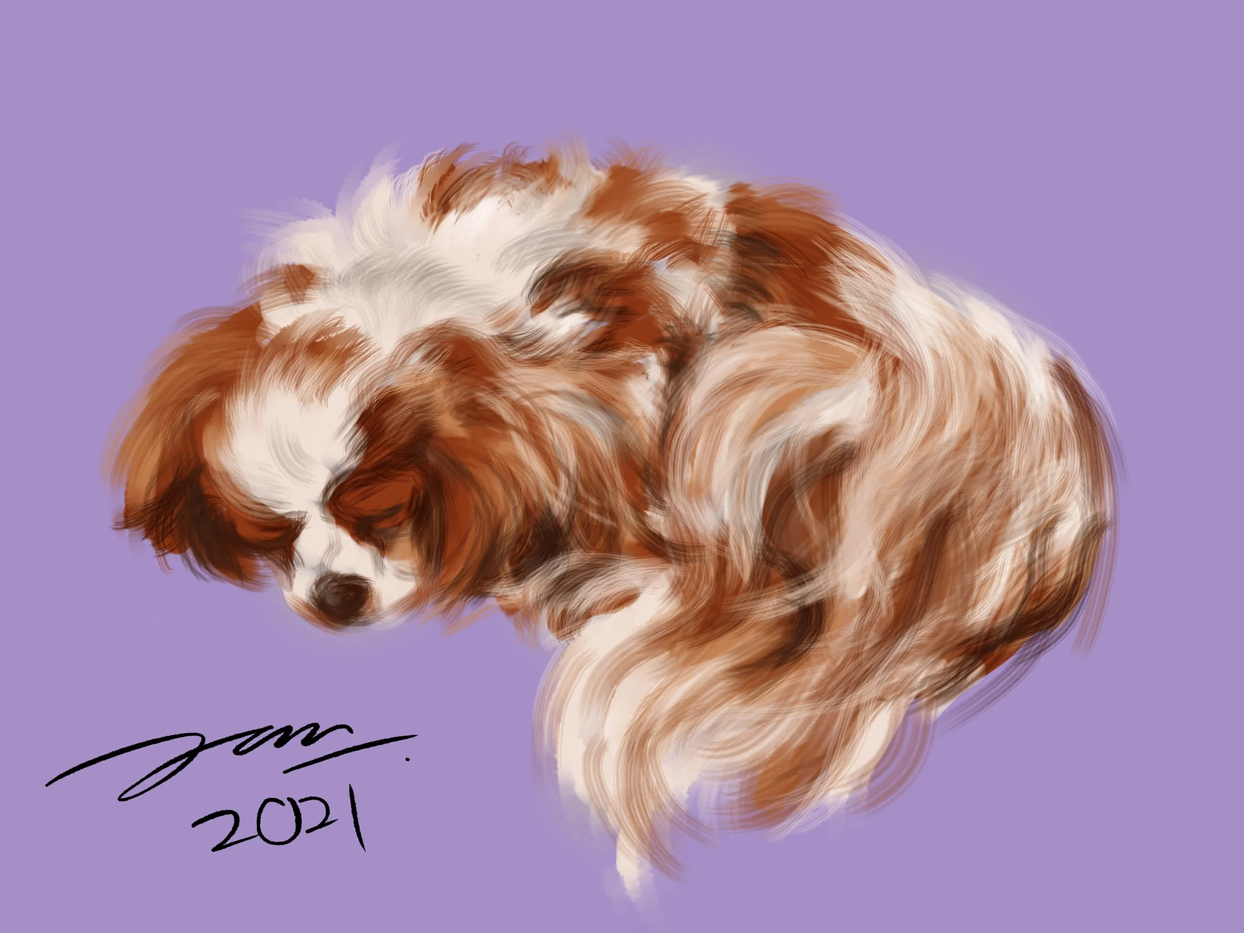 Details: This heartfelt piece features Carnoustie, a beautiful Cavalier King Charles Spaniel who passed away in 2021 due to a heart condition, a common ailment for her breed. On the day she crossed the rainbow bridge, I felt inspired to draw her on paper as a way to honor her memory.